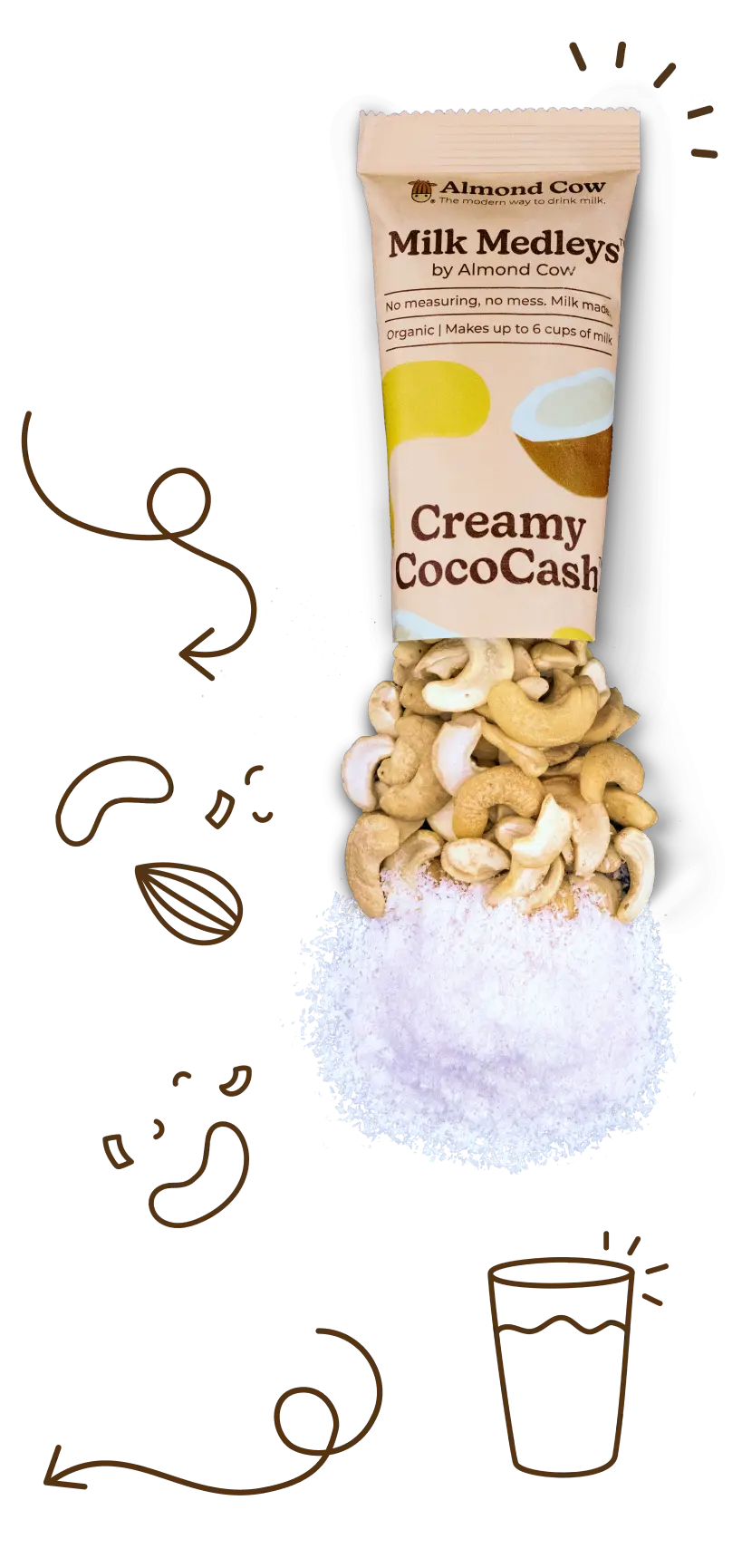 Milk Medleys are Almond Cow’s solution to this! Each of these home compostable sachets contain the perfect balance of whole ingredients and natural sweetness (dates!) to help you make our most popular milk recipes in a trial size. Or, use the pre-measured packets for the long run for easier, more convenient milk every time. No measuring, no mess!