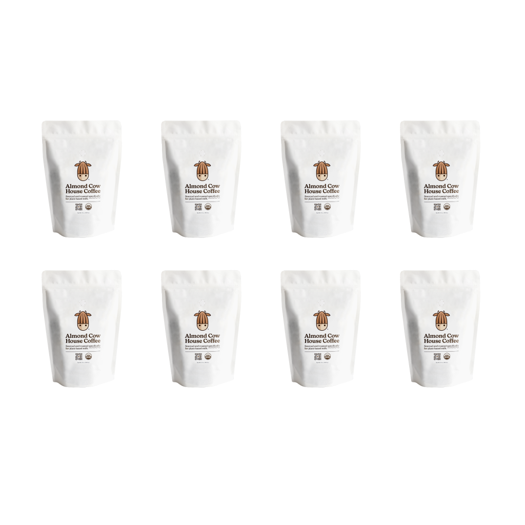 8 bags of our whole bean Organic Almond Cow House Coffee.